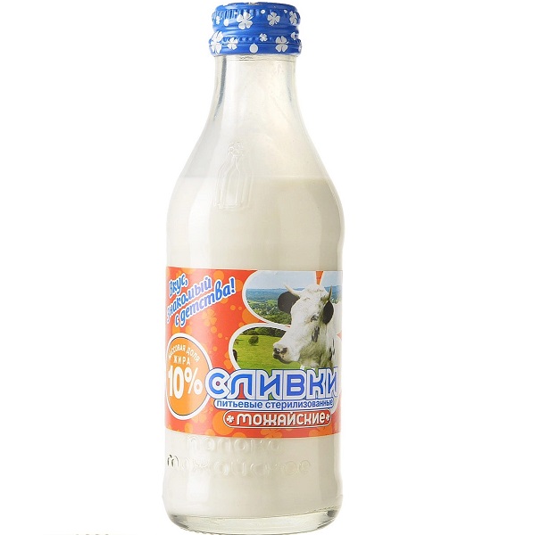 Сливки питьевые стерилизованные «Можайские» массовая доля жира 10,0%. ГОСТ Р 52091, бутылка стеклянная 0,45 л.